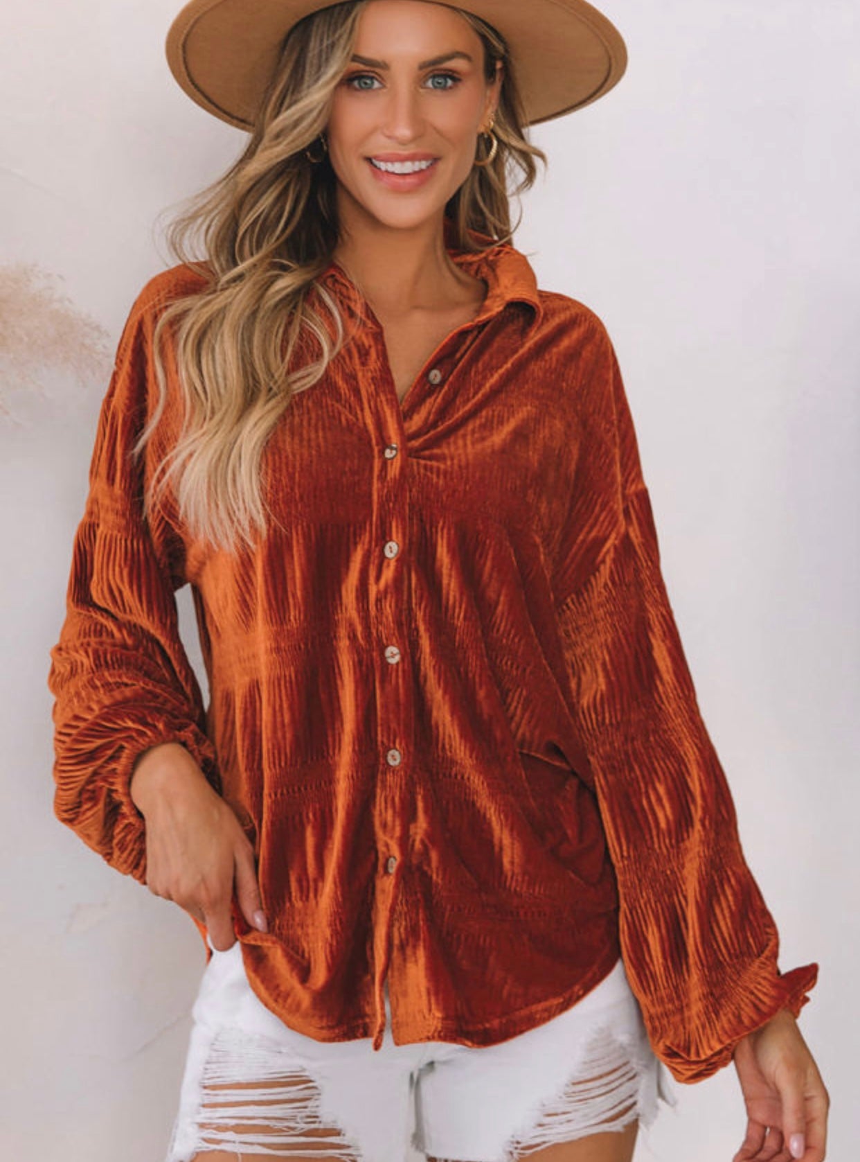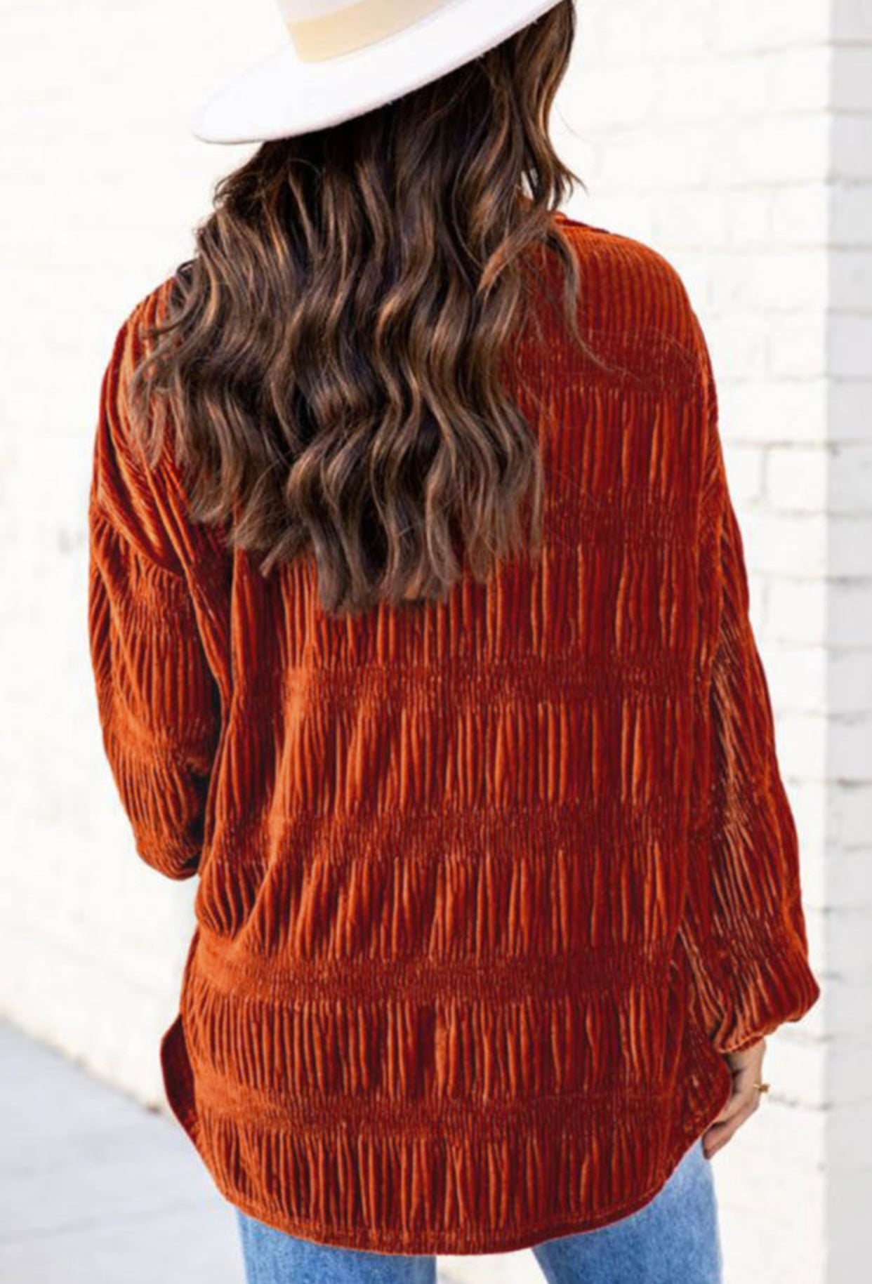 Brown/Rust velvet button up. I can't wait to pair this with a graphic tee and flares! There are several ways to dress it up or down!